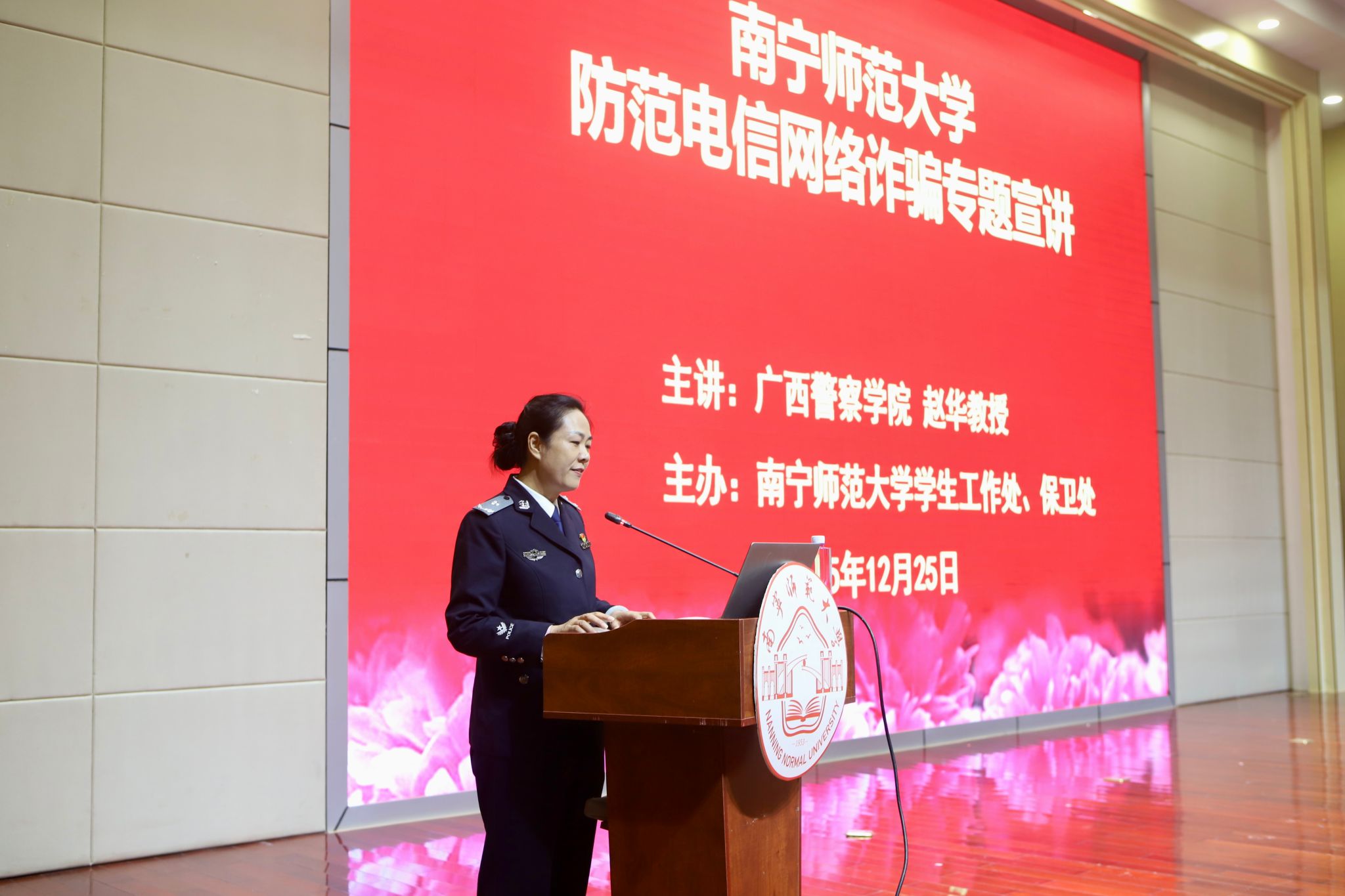 12月25日,自治区教育厅反诈专家宣讲团赵华教授到华体会平台(中国)五合校区文理综合楼114报告厅顺利开展了反诈防骗主题宣讲活动。华体会平台(中国)党委学生工作部副部长邓运明、有关学院辅导员与保卫处负责同志全程参与,现场共有约300名学生参加。