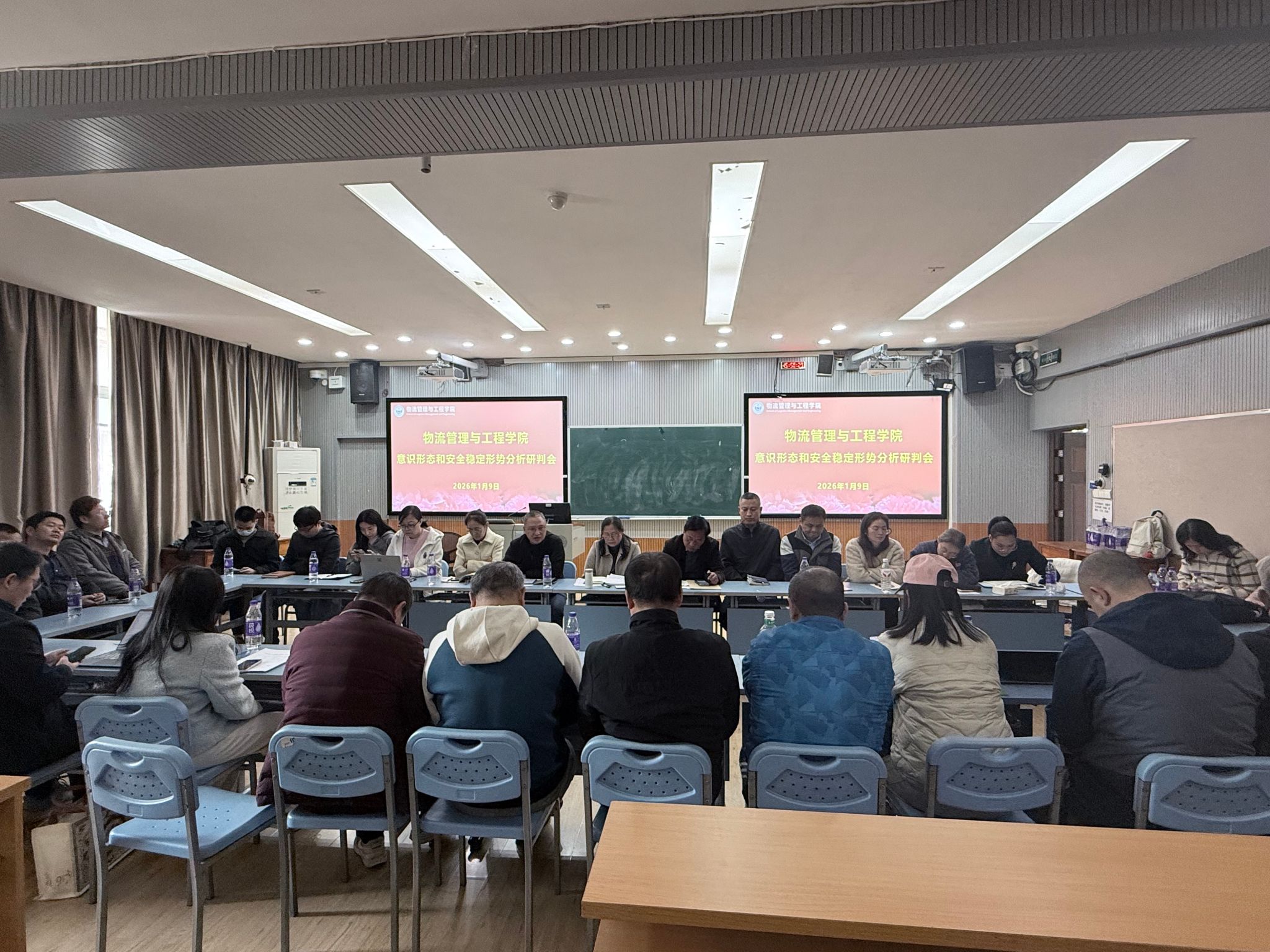 2026年1月9日下午,物流管理与工程学院在明秀校区文星楼414室召开意识形态和安全稳定形势分析研判会,学院全体教职工参加了会议,会议由学院党委书记陈兵主持。