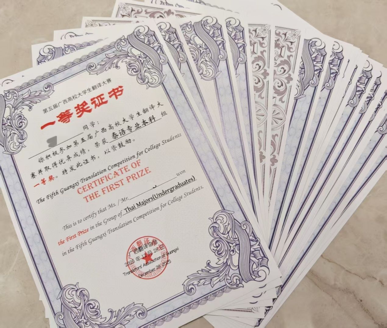 近日,第五届广西高校大学生翻译大赛获奖名单公布。本届大赛首次增设泰语、越南语赛道,国际教育学院积极组织泰语、越南语专业学生参赛,在两项语种竞赛中均取得优异成绩,共获一等奖2项、二等奖2项、三等奖4项及优秀奖8项,展现出了扎实的语言功底与与出色的翻译能力。