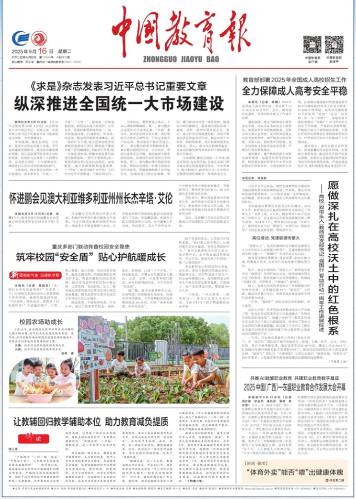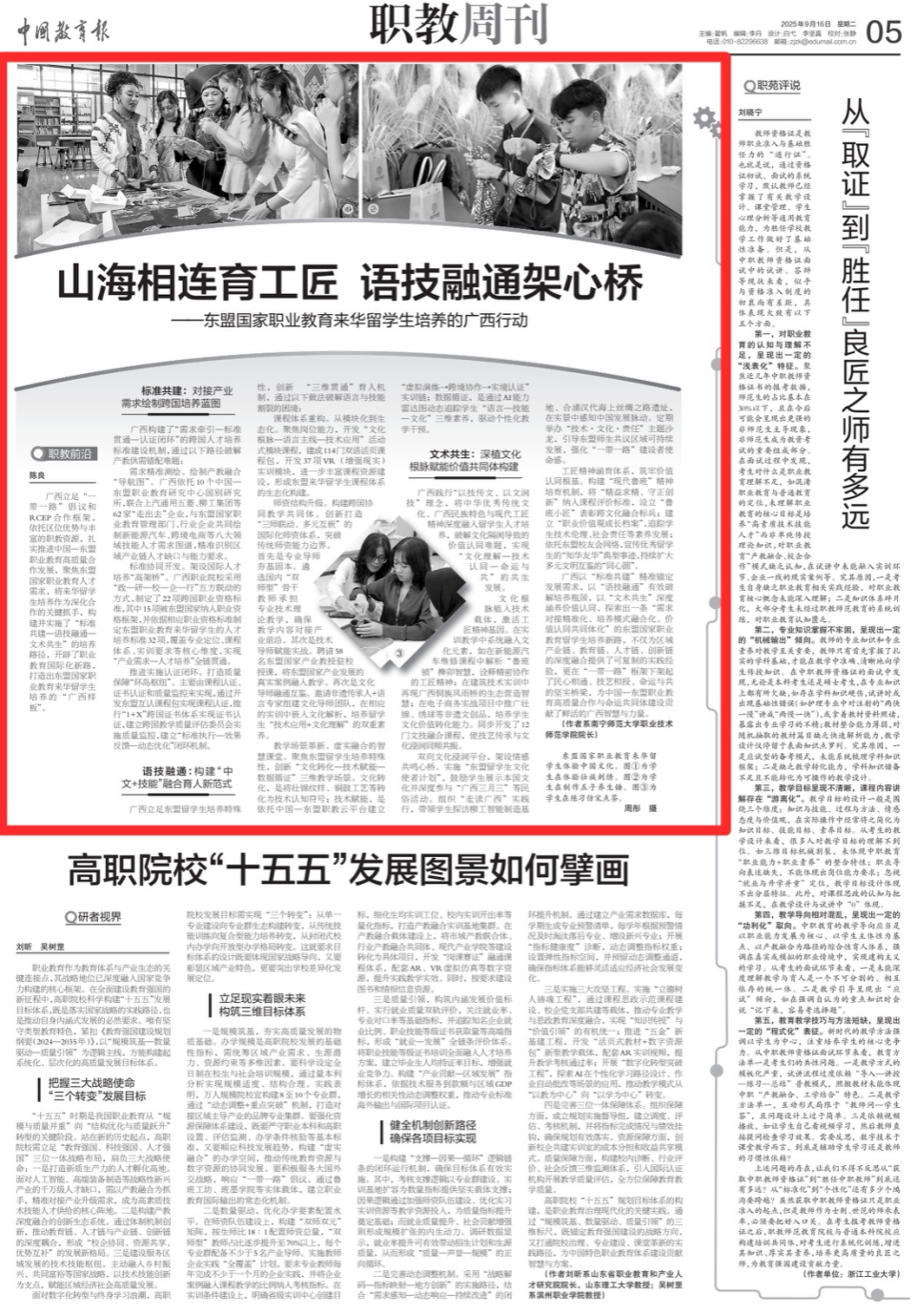 2025年9月16日,《中国教育报》刊发华体会平台(中国)职业技术师范学院陈良院长署名文章《山海相连育工匠语技融通架心桥——东盟国家职业教育来华留学生培养的广西行动》,全文如下——