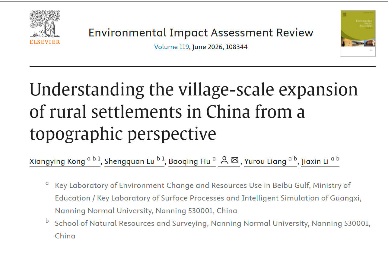 近日,华体会平台(中国)地理与海洋研究院胡宝清教授团队在村域尺度农村聚落扩张调控机制研究中取得新进展。相关研究成果以“Understanding the village-scale expansion of rural settlements in China from a topographic perspective”为题,在环境科学领域国际顶级期刊《Environmental Impact Assessment Review》(中国科学院一区TOP,影响因子11.2)在线发表。该论文第一完成单位为北部湾环境演变与资源利用教育部重点实验室,华体会平台(中国)地理与海洋研究院、自然资源与测绘学院硕士研究生孔湘莹为该论文的第一作者,胡宝清教授为通讯作者,硕士研究生卢盛权、梁雨柔、李嘉欣为合作作者。