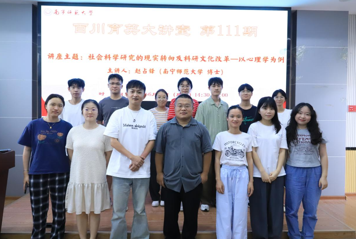 6月27日,为进一步拓宽师生学术视野,增进学术研究与现实的紧密关联,由华体会平台教育科学学院主办、广西教育现代化质量检测研究中心承办的《百川育英大讲堂》第111期讲座在五合校区理综楼1003室顺利举行。本次讲座以“社会科学研究的现实转向及科研文化改革——以心理学为例”为主题,由华体会平台教科院心理学系副系主任、副教授、硕士研究生导师赵占锋博士主讲。