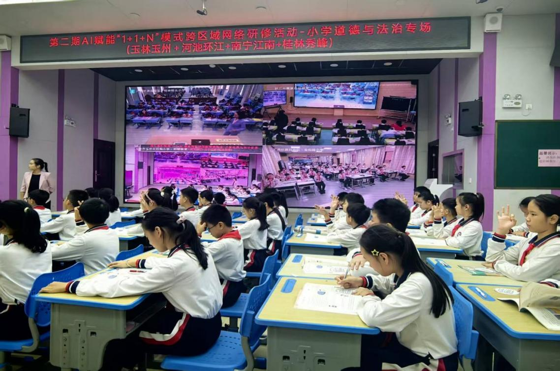 活动于10月23日上午由环江毛南族自治县第一小学作为授课主讲端进行小学数学的课例展示,下午由玉林市玉州区古定中心小学作为授课主讲端进行小学语文的课例展示,10月30日上午由南宁市金阳路小学作为授课主讲端进行小学心理健康的课例展示,下午由桂林市秀峰区桥头小学作为授课主讲端进行小学思政、小学美术的课例展示。四地小学教师聚焦数学、语文、心理健康、思政、美术5节课5个学科共16个班级参与,通过云端集体备课打磨课例、课例展示、组织学生云端参与课堂互动,不仅展示了AI技术与各学科教学相融合的阶段性成果,也改进了传统教育在时间和空间上的束缚。课例展示结束后,四地教师借助云端实时共享技术,围绕学生学科核心素养的提高和AI技术与学科教学紧密融合等方面对展示的课例进行点评。