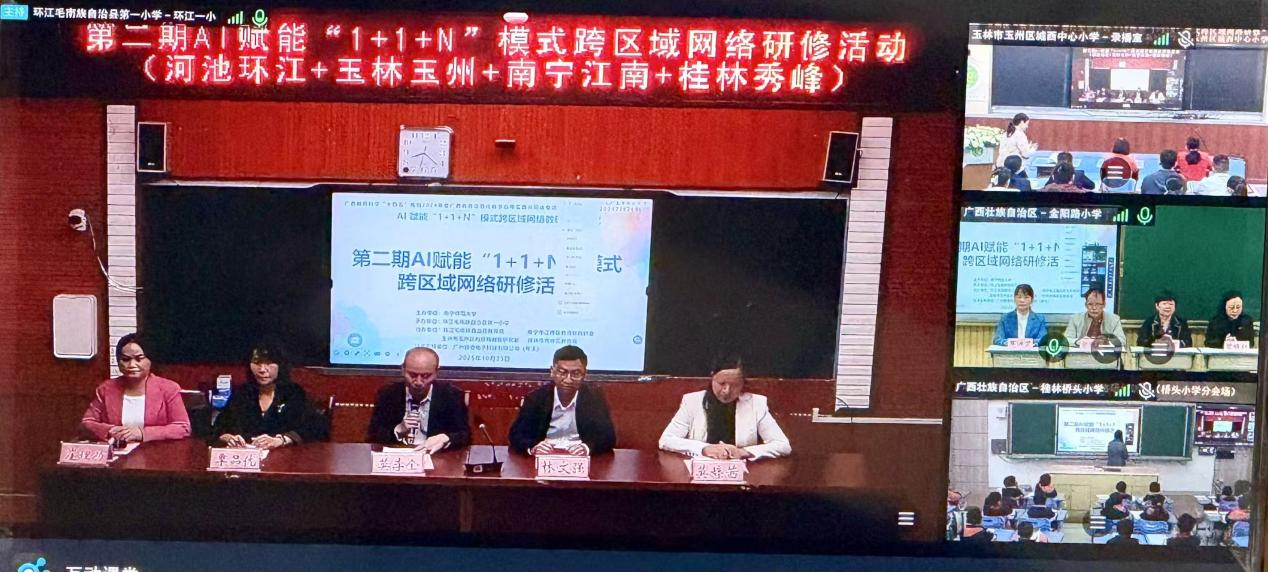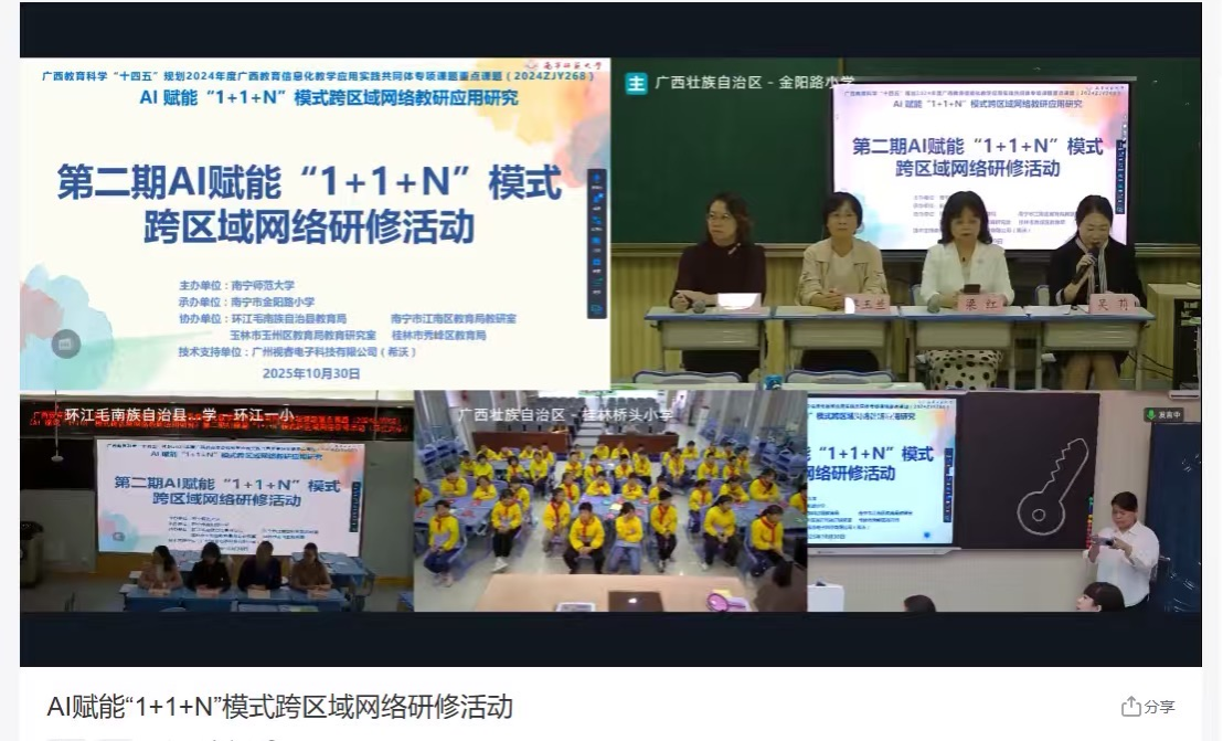 为推动区域间教育交流和优质教育资源共享,提升教师数字化技能与信息素养,推动科研项目研究成果的实践与服务基础教育,由华体会平台教育科学学院余朝文教授主持的“AI赋能‘1+1+N’模式跨区域网络教研应用研究”项目,于10月23日和10月30日开展了第二期网络研修活动,本次活动通过“1个主讲端课堂+3个听讲端课堂”的“1+N专递课堂”形式开展课前异地网络集体备课磨课、云端同步授课、四地学生听课互动、四地教师评课研讨、专家评课及专业微讲座等环节,深入研讨学科教学方法与技巧及AI在课堂教学中的实际应用路径,实现了跨区域间的教学沟通与协作。
