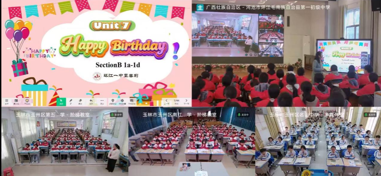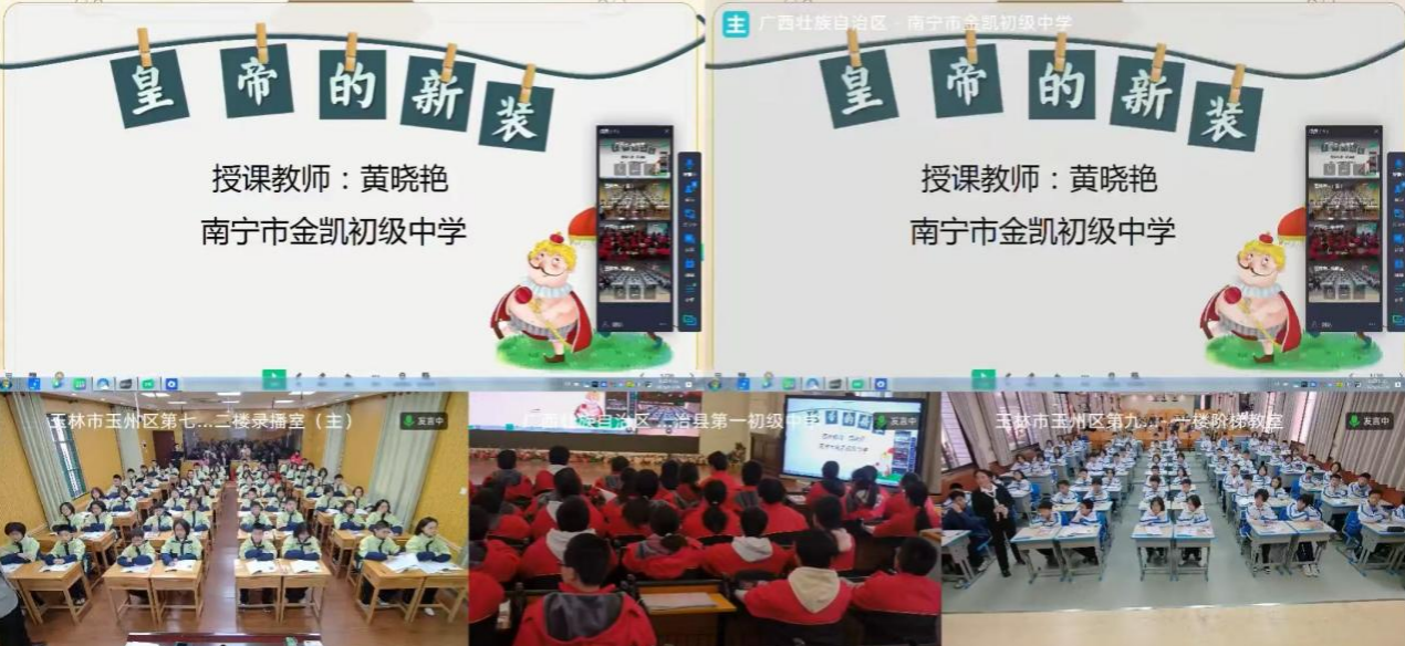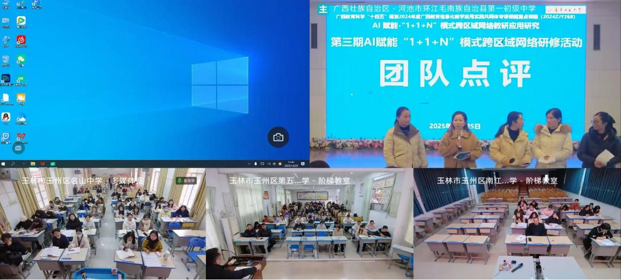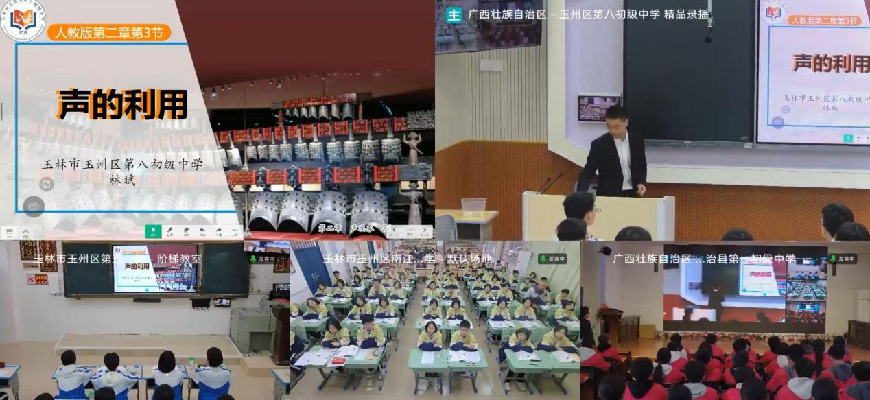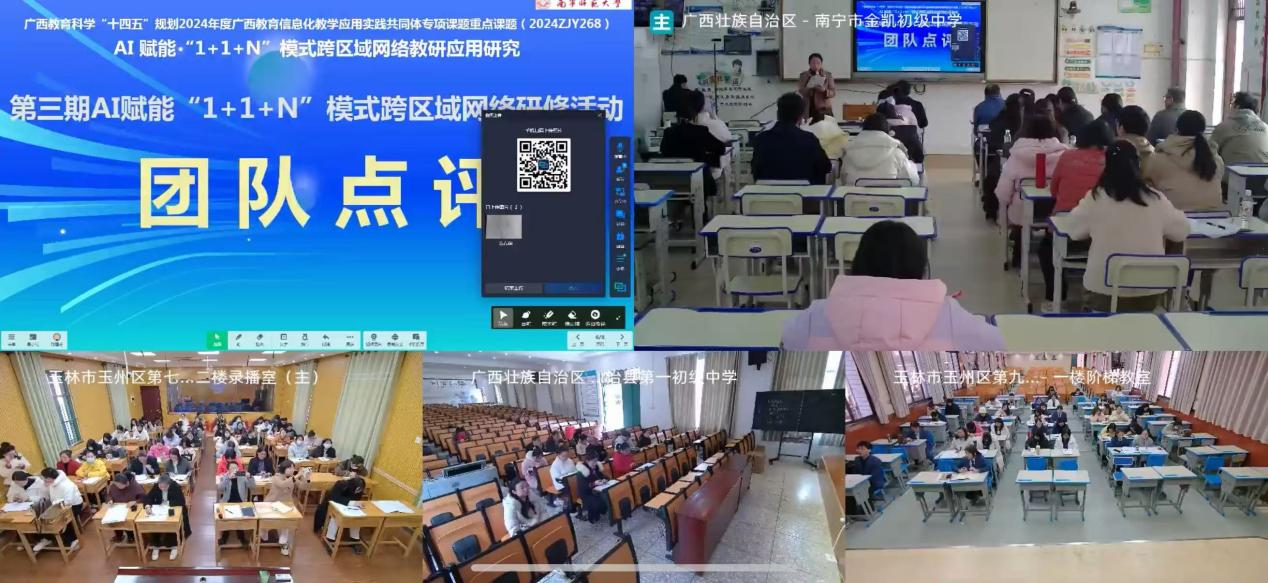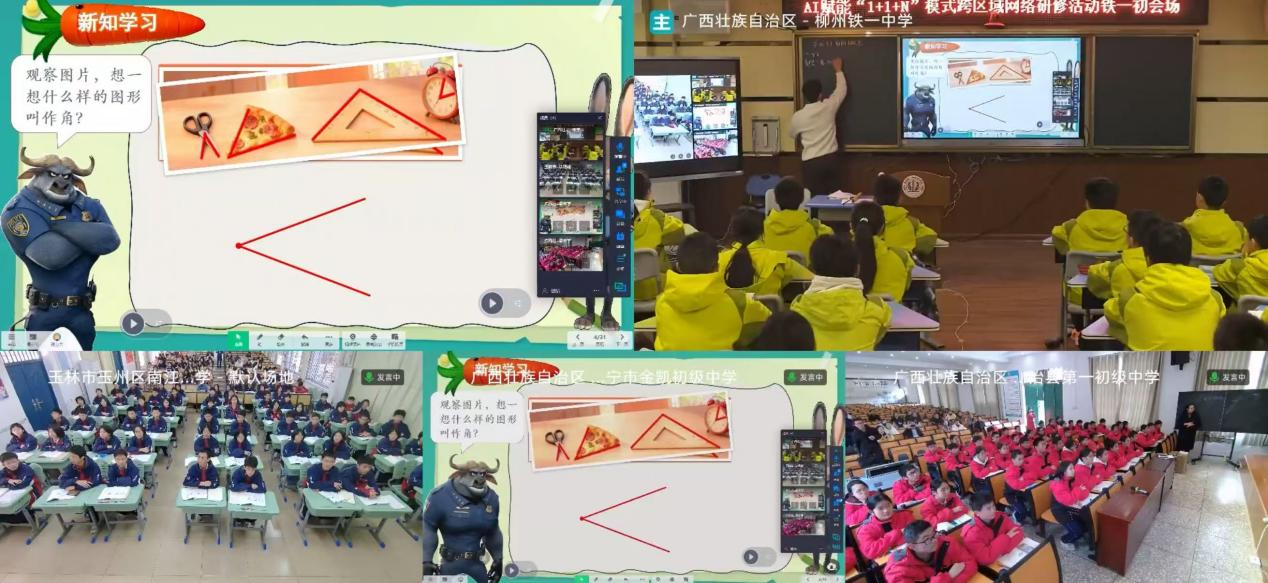 12月25日上午和下午分别由玉林市玉州区第八初级中学、环江毛南族自治县第一初级中学作为授课主讲端进行初中物理和初中英语的课例展示;12月26日上午和下午分别由南宁市江南区金凯初级中学、柳州铁一中学初中部作为授课主讲端进行初中语文、初中数学的课例展示。四地初中教师聚焦物理、语文、英语、数学4节课4个学科共16个班级参与,采用云端集体备课模式,精心打磨课例,并通过课例展示、跨区域学生云端互动等形式,生动呈现了AI赋能学科教学的阶段性成果,打破了传统教育的时空局限。在精彩的课例展示之后,来自四地的教师借助实时互动技术,围绕如何提升学生学科核心素养、如何推动AI与学科教学深度融合等关键话题,对展示课例进行了深入研讨和专业点评。