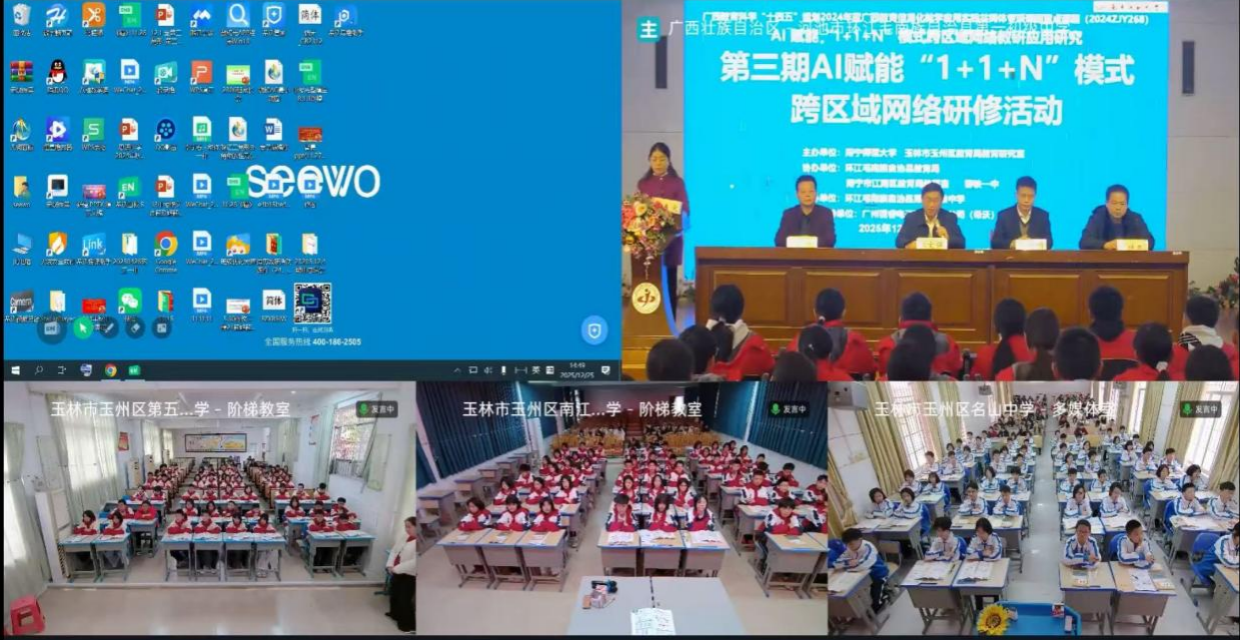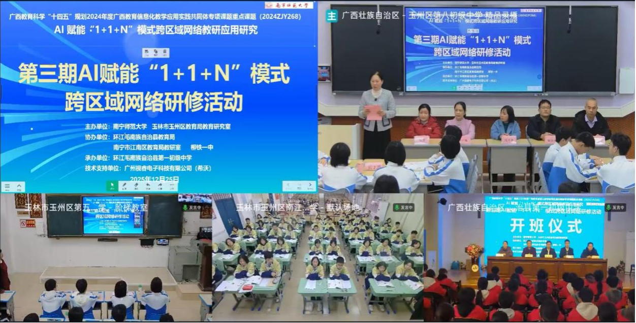 12月25日、26日,由华体会平台教育科学学院余朝文教授主持的“AI赋能‘1+1+N’模式跨区域网络教研应用研究”项目,开展第三期AI赋能“1+1+N”模式跨区域网络研修活动。本次活动由华体会平台教育科学学院主办,由实验区玉林市玉州区教育局教育研究室承办,实验区河池市环江毛南族自治县教育局、南宁市江南区教育局教研室及柳铁一中联合协办,广州视睿电子科技有限公司(希沃)提供技术支持。四县区的教育局及教研室相关领导、10所华体会平台的领导、老师和学生出席开班仪式并全程参与活动。