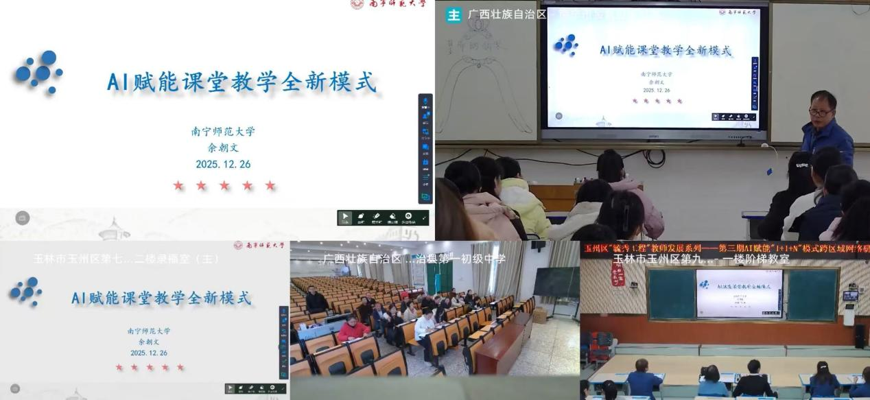 12月26日上午,华体会平台教育科学学院余朝文教授在南宁市金凯初级中学,以《AI赋能课堂教学全新模式》为题,在线上线下向广西四个实验县区的专任教师作学术讲座,把第三期AI赋能“1+1+N”模式跨区域网络研修活动推向高潮。