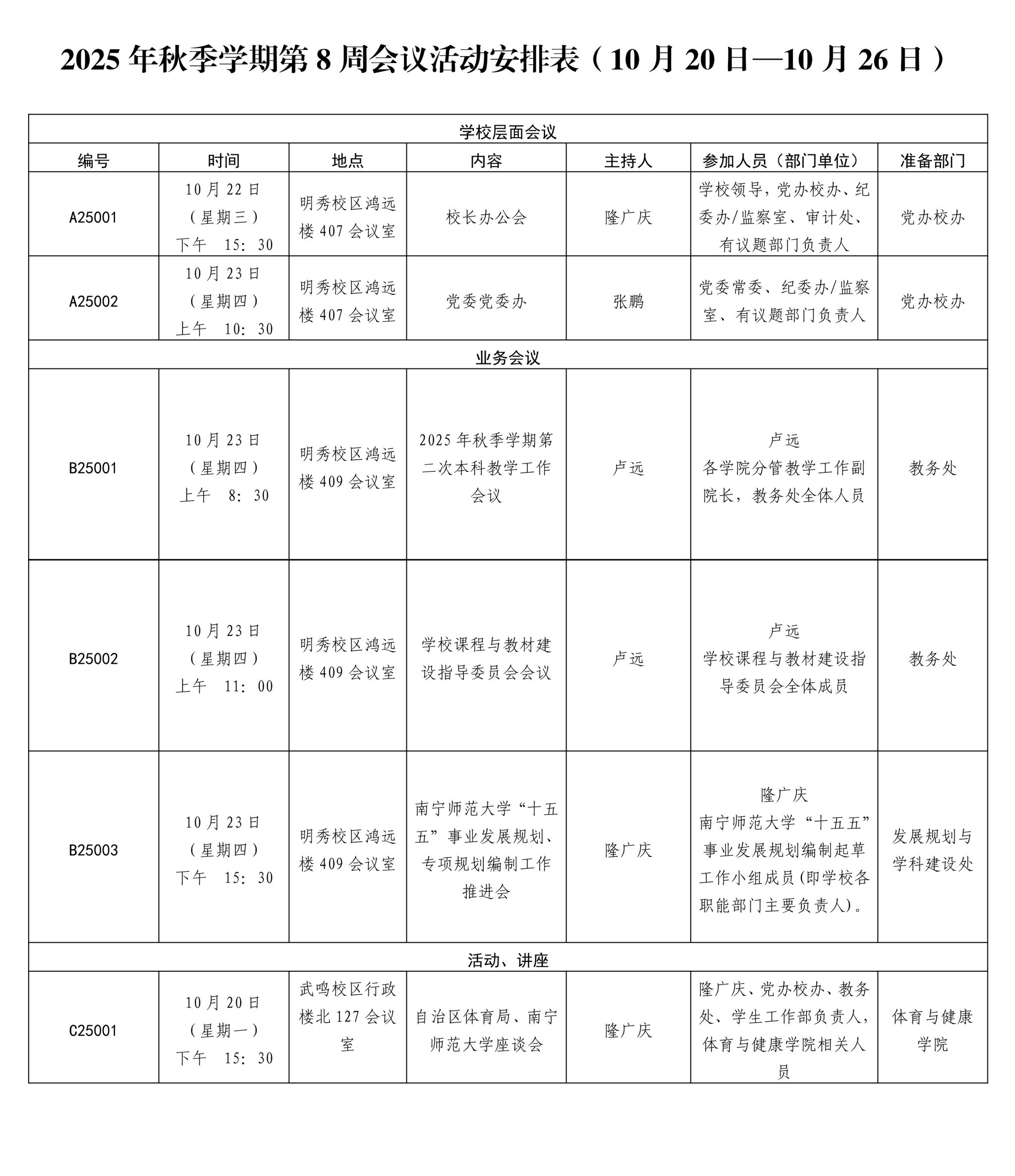 2025年秋季学期第8周会议活动安排表(10月20日—10月26日)